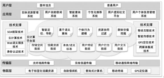 智慧图书馆由物联层、传输层、云计算平台层、应用层、用户以及技术支撑六个部分组成。物联层包括RFID、智能传感、自动定位技术支持下的电子标签化馆藏资源、自助借阅机、查询式计算机、移动终端以及GPS定位器等设备部署,用以实现馆藏图书的自动上架、智能导航。