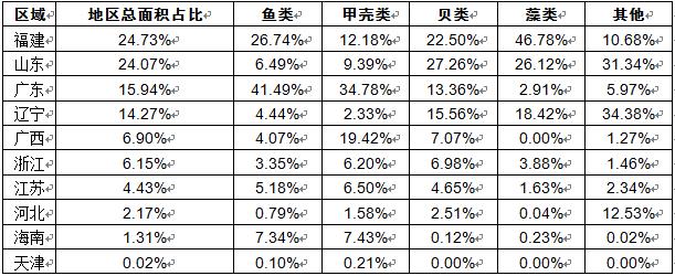 而在鱼类和甲壳类品种上,广东区占有优势,两个物种的养殖面积分别占全国对于物种养殖面积的41.49%和34.78%
