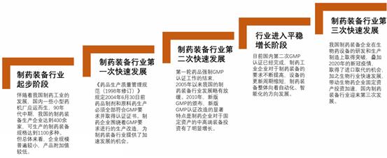 我国制药装备行业起步于20世纪90年代,2004年的第一轮GMP认证对行业发展起到较大促进作用,2011年开始的第二轮GMP认证再次推动行业快速发展。近年来我国生物药行业快速发展,带动生物药企业固定资产投资加速。同时国内制药装备企业在生物药设备的研发和生产制造上取得突破,叠加2020年的新冠疫情,国内制药装备进口替代加速,行业迎来第三次快速发展。
