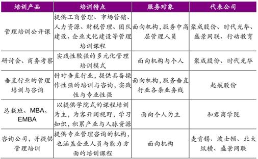 根据相关测算,国内广义上的企业管理培训行业市场规模突破4000亿元,而负责企业培训的主体一般包括国内高校以及相关民办培训机构。高校的企业培训项目主要指国内高等学院开设的MBA或EMBA项目。而民办机构运营主体包括跨国培训公司在华机构、咨询专注型公司和企业管理培训公司。通常情况下,高校培训侧重前沿理论知识传授,而社会培训更加侧重于实务管理技能的培养。从培训效果上看,管理培训公司的课程更容易落地实操,目前已拥有诸多成功案例,或更适合中小企业家提高自身管理能力。
