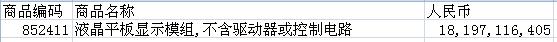 2022年中国海关总署将“液晶显示板”(编码9013803)作废,增加852411、852491,条目改称“液晶平板显示模组”,商品范围有所扩大,下同。