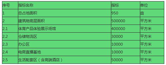 根据当前规划,体育产业项目总投资120亿元,建设物底层建筑面积50万平方米,其中:体育产品体验展示场馆40万平米,仓储物流区3万平米,办公区1万平米,电商直播基地1万平米,配套区5万平米。