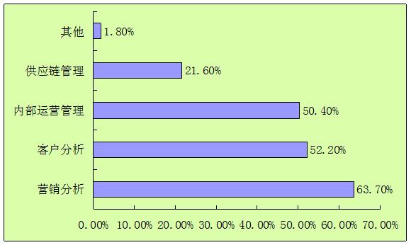 营销分析、客户分析和内部运营管理是大数据应用最广泛的三个领域。调查发现,超过60%的企业将大数据应用于营销分析;其次,52.2%的企业将大数据应用于客户分析;另外,超过50%的企业将大数据应用于内部运营管理。相比之下大数据分析在企业供应链管理等方面的应用比例还有待提升。