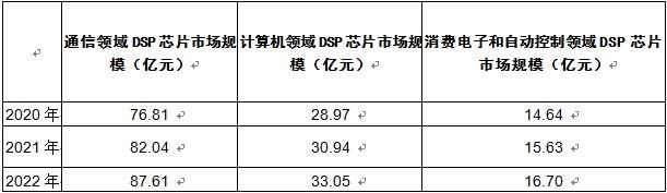 DSP芯片行业主要应用领域分别是通信领域、计算机领域和消费电子自动控制领域,通信领域2022年DSP芯片市场规模为87.61亿元,计算机领域2022年DSP芯片市场规模为33.05亿元,消费电子和自动控制领域DSP芯片市场规模为16.7亿元,平均年增速为10%。