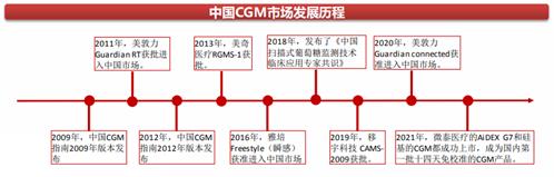 2017年,圣美迪诺S203、T203获批。2018年,中国专家组参考当年《持续血糖监测应用国际共识》,制订并发布了《中国扫描式葡萄糖监测技术临床应用专家共识》,以指导扫描式葡萄糖监测系统的应用,在医生和患者教育层面取得一定成果。同年普林斯顿CGMS-2009获批。2019年,移宇科技CAMS-2009获批。2020年,美敦力Guardianconnected获准进入中国市场。2021年,微泰医疗的AiDEXG7和硅基的CGM都成功上市,成为国内第一批十四天免校准的CGM产品。
