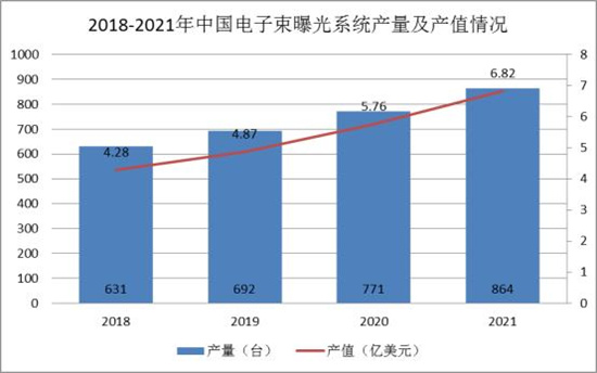 近年来,中国电子束曝光系统的产量和产值都呈现出较快的增长态势。据统计,2021年,中国电子束曝光系统的产量约为864台,同比增长12.06%;产值约为6.82亿美元,同比增长18.40%。