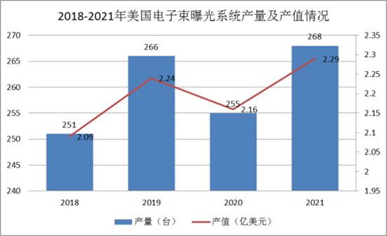 据统计,2021年美国电子束曝光系统的产量约为268台,较2020年增长了5.10%;产值约为2.29亿美元,较2020年增长了6.02%。