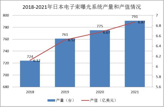 图表:2018-2021年日本电子束曝光系统产量及产值情况