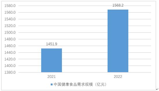 中国健康食品市场需求量不断攀升,从2021年的1451.9亿元增长至2022年的1568.2亿元。这说明中国消费者对健康食品的认知和接受度逐步提高,也彰显了健康生活方式的推广成效显著。随着中国经济的快速发展,人均收入不断增加,消费能力逐渐提高,为健康食品市场提供了广阔的市场基础。