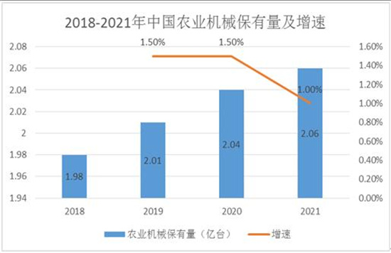 近几年我国农业机械保有量逐年增加,其中2021年中国农业机械保有量为2.06亿台,同比增长1%。
