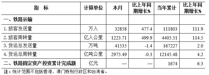 2022年全国铁路货运总发送量完成49.84亿吨,比上年增长4.4%。全国铁路旅客发送量完成16.73亿人。