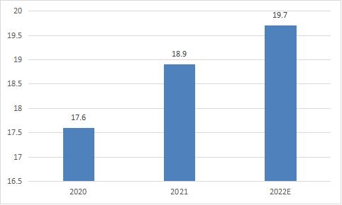 随着轻骨料混泥土行业景气度不断上升,对行业的收益预期也有所增长,且在环保政策的密集发布背景下,轻骨料混凝土行业新进入者企业不断增加,行业竞争激烈程度也不断上升,2020-2022年在产能增长及价格抬升的推动下,轻骨料混凝土行业总产值不断上升,2021年轻骨料混凝土行业总产值规模达18.9亿元,相较2020年同比增长17.3%,行业景气度增长比较快。2022年预计产量规模达到19.7亿元。
