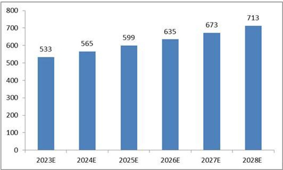 图表:2023-2028年香精香料行业市场规模预测(单位:亿元)