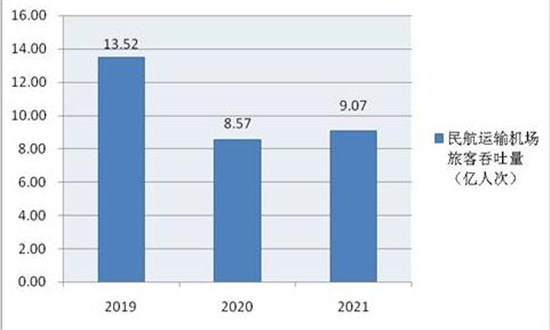 图表:2019-2021年中国民航运输机场旅客吞吐量(单位:亿人次)
