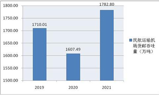 图表:2019-2021年中国民航运输机场货邮吞吐量(单位:万吨)