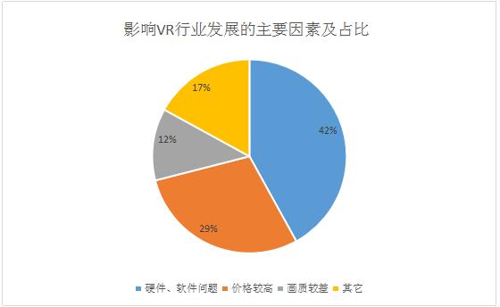 影响VR/AR行业发展的主要因素中,硬件、软件问题是一大难题,占比约42%。