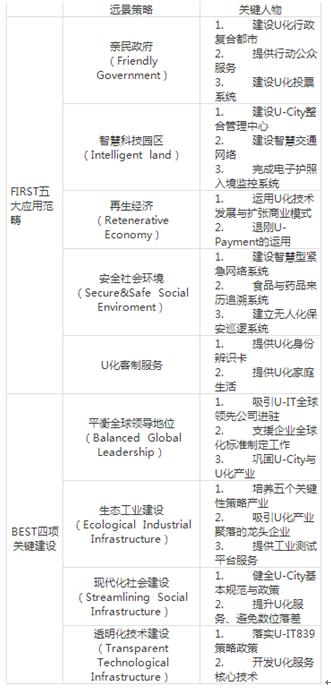 (1)发展期(计划实施第一个五年)。让U-City成为韩国经济增长新引擎,培育U-City新型产业。本阶段重点任务为基础建设的建置、技术的应用以及U化社会制度的建立,除发展U化物流配销体系、U化健康看护等无所不在的服务(Ubiquitous Service)、扶持U化产业与新兴市场,也将完成无所不在网络基础建设的建置工作、IT技术在生物科技与纳米科技各领域的应用、建立U化社会规范。