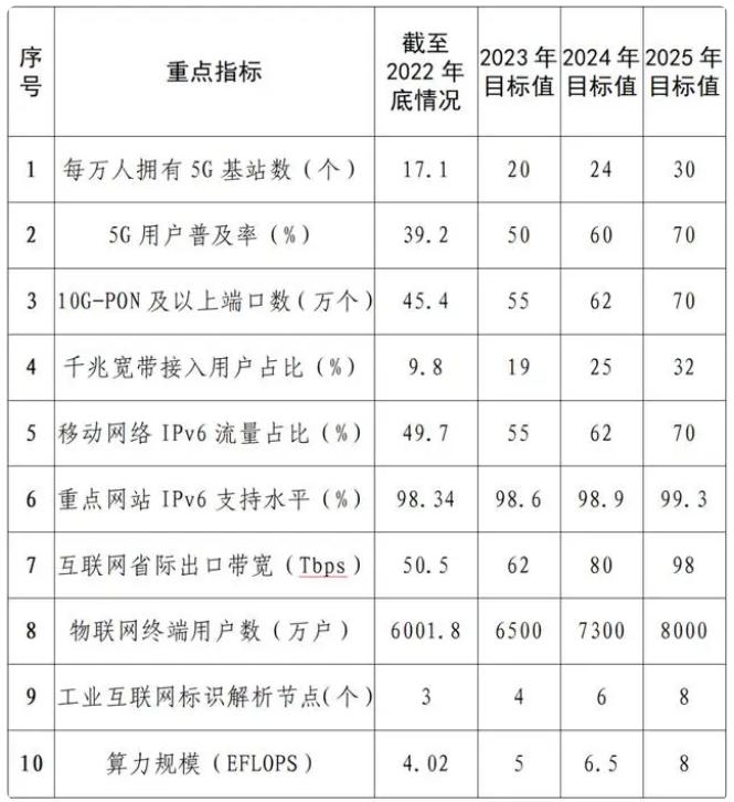 到2025年,全省新型基础设施建设取得突破性进展,基本形成以新发展理念为引领,以科技创新为驱动,泛在连接、高速智能、天地一体的信息基础设施体系,数字化、网络化、智能化的融合基础设施体系,技术先进、模式创新、服务高效的创新基础设施体系。我省每万人拥有5G基站30个,互联网省际出口带宽达98Tbps,高性能计算峰值算力超300PFLOPS(每秒一千万亿次运算),打造数据中心网络“城区1ms、中心城市间5ms”超低时延圈,力争融入全国一体化大数据中心协同创新体系。