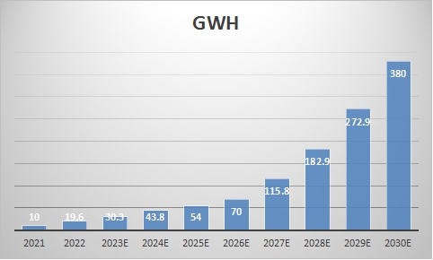 2022年退役电池19.6GWh,对应96.2亿市场;2027年退役电池 115.8GWh,对应305亿市场。中国储能装机将持续高增长,2025年到86.21GWh。
