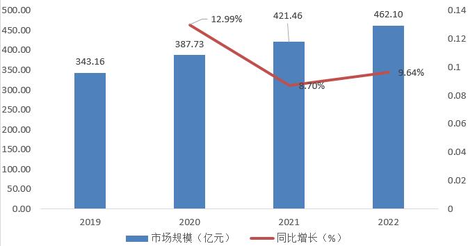 受市场供需总量提高、产品价格走高等直接原因影响,我国BOPP膜市场规模持续走高,2021年时,达到421.46亿元。进入2022年,由于疫情带来的通胀压力,国际地缘政治冲突引发的能源危机等一系列原因,BOPP行业虽然受到一定的冲击,但市场规模总体维持增长趋势。2022年BOPP薄膜的市场规模达到462.1亿元,同比增长9.64%。