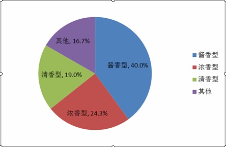 北京市高端白酒行业销售产品结构主要以酱香型白酒为主,占比为40%,其次分别为浓香型,清香型和清香型,占比分别为24.3%、19%、和16.7%。