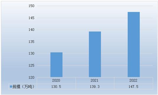 2020-2022年中国豆奶产量由130.5万吨上升到147.5万吨,保持稳步上升。