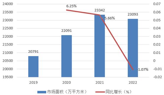 从全国规模以上建材家居市场面积来看。2019年,2020年分别是20791万平方米,22091万平方米。2022年市场面积首次下滑,全国规模以上建材家居市场面积约为23093万平方米,同比增长率为-1.07%;增长率逐年递减,近年来,全国规模以上建材家居市场面积增长率逐年递减,2022年首次转负;市场竞争愈演愈烈,小微企业生存举步维艰。