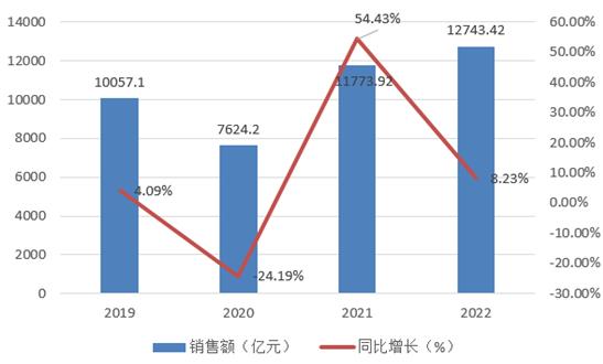 数据显示,2019-2022年,我国规模以上家居建材卖场销售额呈现先下降后上升的变化趋势。2020年全年中国规模以上建材家居卖场累计销售额达到7624.2亿元,累计下降24.19%。2021年开始回升,2021年全年累计销售额为11773.92亿元,同比上涨54.43%。
