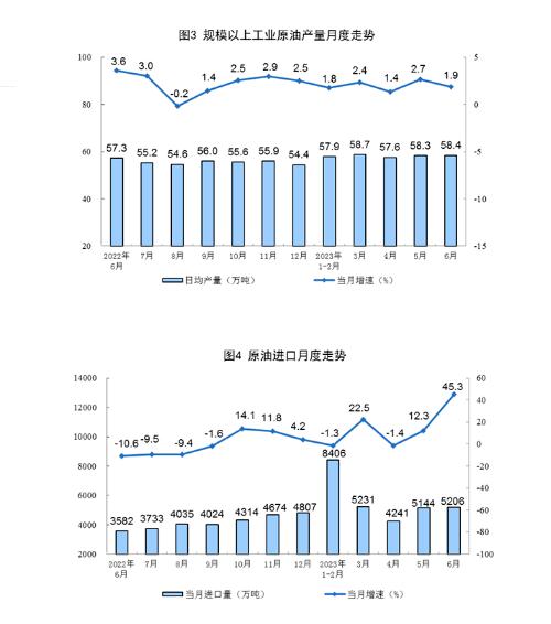 原油生产保持平稳,进口快速增长,原油加工较快增长。上半年,生产原油10505万吨,同比增长2.1%。进口原油28208万吨,同比增长11.7%。加工原油36358万吨,同比增长9.9%。6月份,生产原油1752万吨,同比增长1.9%。加工原油6095万吨,同比增长10.2%。