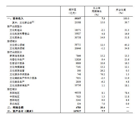 分产业类型看,文化制造业实现营业收入18571亿元,比上年同期下降2.1%;文化批发和零售业10027亿元,增长4.8%;文化服务业30758亿元,增长14.9%。