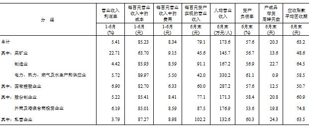 6月末,规模以上工业企业每百元资产实现的营业收入为79.1元,同比减少6.2元;人均营业收入为173.6万元,同比增加5.1万元;产成品存货周转天数为20.3天,同比增加1.1天;应收账款平均回收期为63.2天,同比增加6.4天。