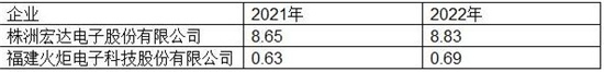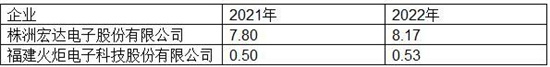 在高端电容器市场,特别是在军工领域具有明显竞争优势,2022年株洲宏达电子股份有限公司产值8.83亿元,福建火炬电子科技股份有限公司产值为0.69亿元。