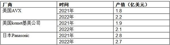2022年美国AVX、美国kemet基美公司、日本Panasonic钽电容器产值分别为2.2、2.1、2.7亿美元。