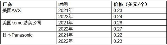 2022年美国AVX、美国kemet基美公司、日本Panasonic钽电容器价格分别为0.24、0.27、0.23美元/个。