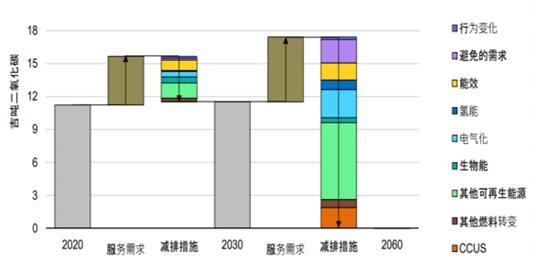 对我国来说,实现碳中和将长期依靠能效提升和可再生能源的发展。市场通常更关心如何调整能源供给结构,提供清洁电力,而忽略了用能行业“需求侧改革”同样可以释放边际贡献。据IEA研究,从2020年到2030年,在承诺目标情景下,仅能效一项就将贡献2030年二氧化碳减排量的四分之一左右;2030-2060年,其他可用技术如CCUS、可再生能源大规模应用等,减碳贡献将提高,能效贡献占比将下降,但仍占减排总量的12%,可再生能源贡献率达到40%。