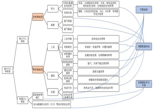我国碳中和目标实现压力大,将对碳达峰高度形成牵制。实现碳中和目标,其难度与碳达峰峰值有直接联系。2030年前碳达峰峰值越低,意味着2060年碳中和的难度就越小,由于我国碳达峰到碳中和时间只有30年,远小于欧盟等发达经济体50~70年过渡期,因此碳中和目标或将对碳达峰高度形成牵制,应尽可能提前实现碳达峰并降低峰值。降低CO2净排放包括减少排放和加强吸收两种方式,如何减少排放是未来工作重点。由于吸收CO2的两种方式生态吸收与人工吸收规模有限,我们预计在2030年以后有望大规模应用,因此中短期减碳主要依靠减少排放。供给侧看,应减少化石能源消费,以风电、光伏为代表的非化石能源发电技术带动电力系统横向扩张;需求侧看,应提高工业、建筑、交通等主要用能部门的能源利用效率,发展循环利用。我们认为聚焦当下,实现双碳的步骤由近及远应为“节能减排”、“能源结构调整”、“发展碳技术与市场”。