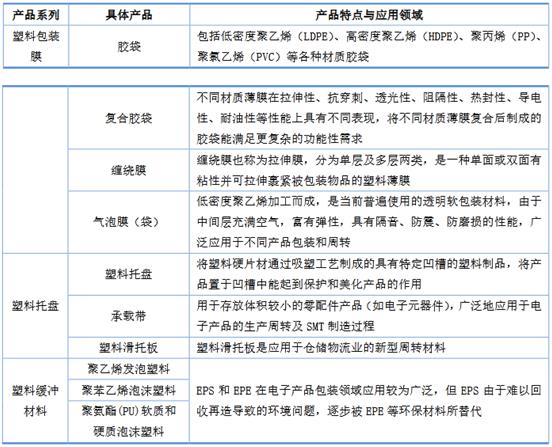 从包材类别及应用领域划分,电子产品塑料包装材料主要包括塑料包装膜、塑料托盘和塑料缓冲材料三大系列产品: