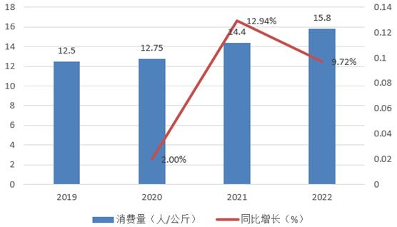 我国人均牛奶消费量近几年稳中有升,人均牛奶消费金额总体呈增加态势。从消费量来看,近几年我国人均牛奶消费量维持在10kg/人以上。2022年,受疫情影响,居民对牛奶可以提高免疫力的认知度有所提高,我国人均牛奶消费量为15.8kg/人,同比增长9.72%。从消费金额来看,