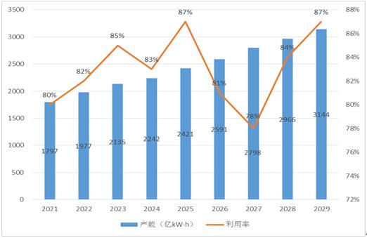 图表:2021-2029年全球电气化铁路牵引供电系统产能、产能利用率预测