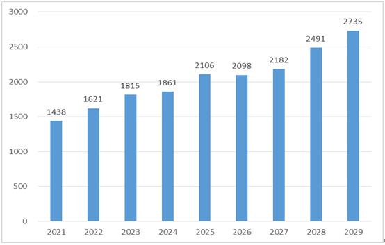 图表:2021-2029年全球电气化铁路牵引供电系统产量趋势及预测(单位:亿kW·h)