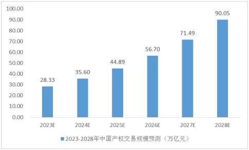 中国产权协会的数据显示,2022年,国内产权市场交易规模达到22.50万亿元。2012年至2022年,国内产权市场累计交易额达到113.39万亿元,年均复合增长率达25.9%。据此计算,2023-2028年,我国产权交易行业交易规模将保持快速增长,预测到2028年将达90.05万亿元。