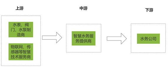 智慧水务行业产业链上游产业包括水表、阀门、水泵制造商以及物联网、传感器等智慧技术服务商;智慧水务服务提供商构成行业中游;下游为一系列水务公司。