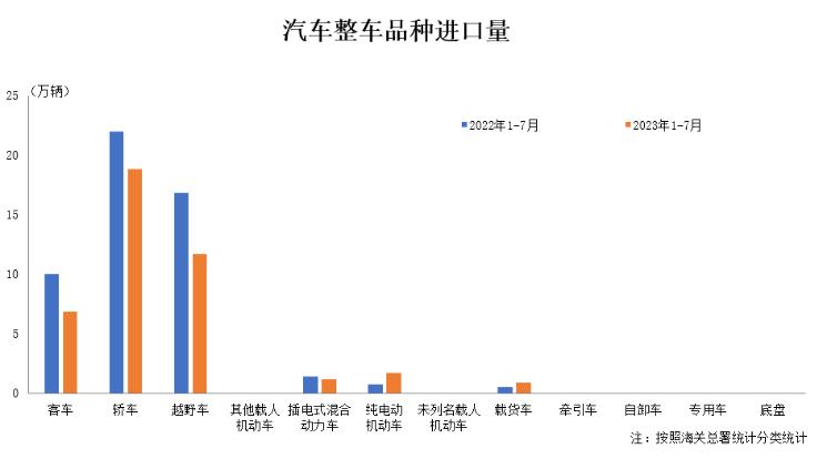 2023年7月,在汽车主要进口品种中,与上月相比,小型客车、轿车、越野车进口量均有所增长;与上年同期相比,轿车进口量小幅增长,小型客车、越野车进口量均呈不同程度下降,其中越野车呈明显下降。上述三大类汽车品种占汽车进口总量的90.3%。2023年1-7月,与上年同期相比,轿车、越野车和小型客车进口量均明显下降。上述三大类汽车品种占汽车进口总量的90.6%。