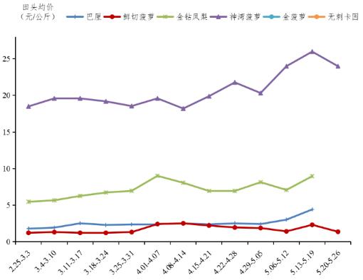 菠萝田头行情上涨。5月菠萝进入上市高峰期,湛江产区菠萝上市进度100%,神湾菠萝上市进度约75%。据省农业信息监测体系,巴厘菠萝上市量减少,环比下跌65%,田头均价3.3元/公斤,环比下跌52%。巴厘鲜切果田头均价2.1元/公斤,环比下跌13%;金钻凤梨田头均价8.1元/公斤,环比下跌4%;神湾菠萝田头均价为23.6元/公斤,环比上涨22%。