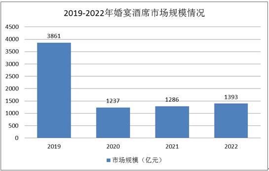 近几年,国内结婚登记数量呈下降趋势,同时由于受疫情的影响,各地区对婚宴采取简办、缓办等措施,且家庭宴会居多,到酒店去办婚宴的消费者呈明显的下降趋势,以此来看,整个婚宴酒席市场在2020年下降幅度较大,且2020-2022年三年疫情影响下,婚宴酒席市场没有太大幅度的增长。