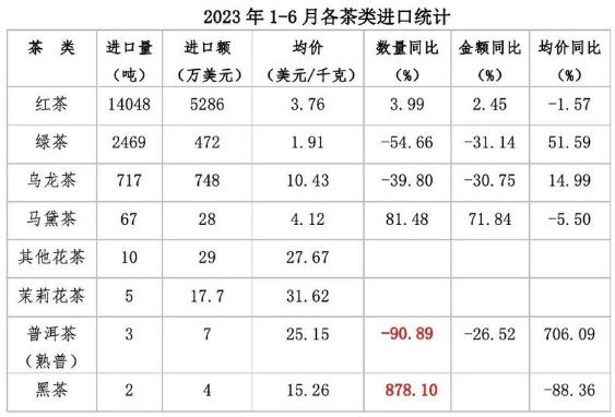 据海关统计,2023年1—6月,我国进口茶叶1.73万吨,金额6593万美元,同比分别下降14.41%和6.08%,均价3.81美元/千克,同比上升9.8%。
