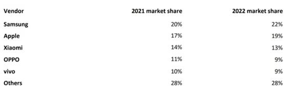 从 2022 年全年来看,三星以22%的出货量份额排名第一,相比上一年份额提升了2%,而2022年Q4则是以20%的份额排名第二,份额相比上一年提升1%。