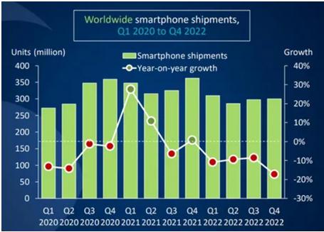 根据调研机构Canalys发布的最新资讯,与 2021 年第四季度相比,2022年第四季度市场萎缩17%。2022 全年出货量下降了11%,低于12亿部。预计2023年手机市场仍将面临严峻考验。