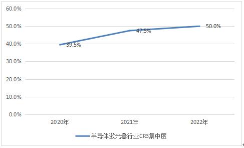 (砷化镓)半导体激光器件市场集中度:随着技术的不断进步,半导体激光已经逐渐成为具有发展潜力的领域,近几年国家加大了对相关产业的支持力度,为行业内企业的发展提供动力,半导体激光器作为重要的设备之一,行业集中度也在不断提升,据调研数据,2022年,中国半导体激光器行业CR3达50%,同比2021年大幅提高约2.5%,增速较上年放缓5.5个百分点左右。