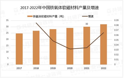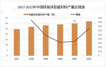 图表:2017-2022年中国铁氧体软磁材料产量及增速